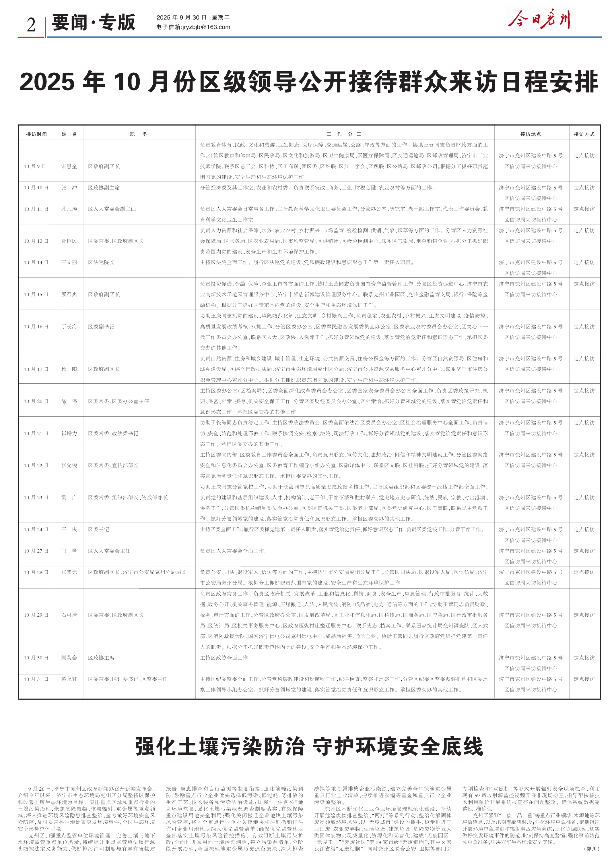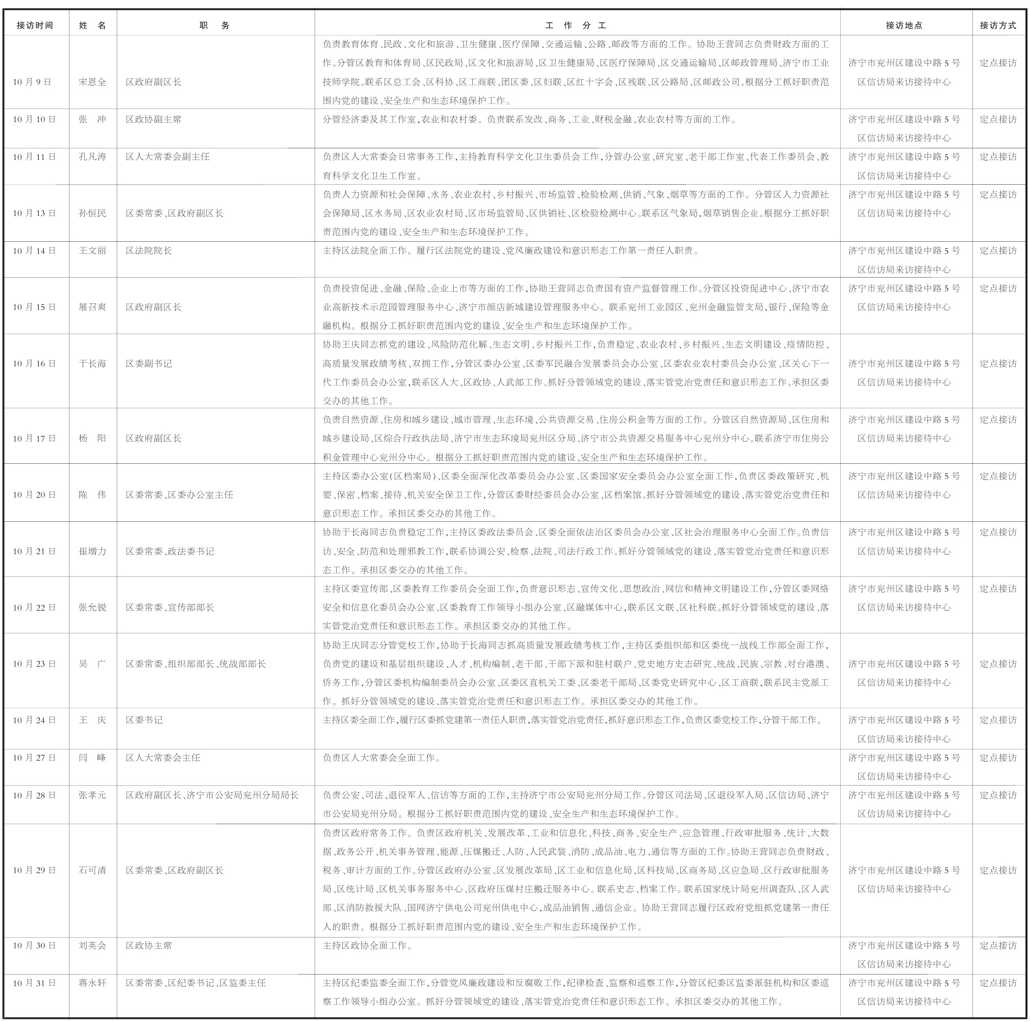 2025年10月份区级领导公开接待群众来访日程安排