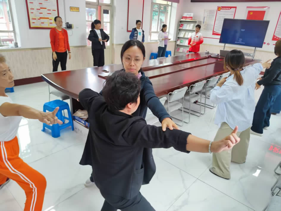 居民们的学习热情在亲身实践中被彻底点燃。大家纷纷起身,在教练的带领下,随着音乐节奏一招一式地认真模仿。有的凝神静气,仔细揣摩动作的细微角度;有的轻声交流,相互纠正手势与步伐。教练们穿梭其间,或集体领做,或个别辅导,耐心地为一位居民调整“摇头摆尾”时的腰部姿势,又轻柔地提示另一位在“攒拳怒目”时注意气息下沉。许多居民主动用手机记录下教学全程,表示要带回家中反复观摩练习,将这份健康习惯坚持下去。